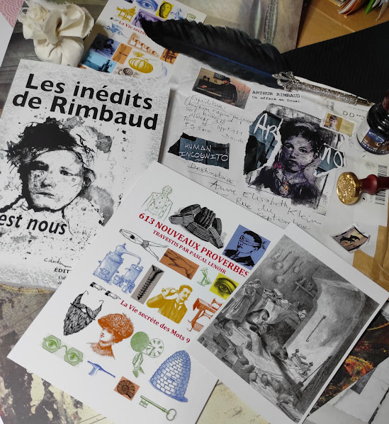 La calligraphie d'Anne-Elisabeth Klein & les 4 collages de Jocelyne Di Giuseppe, qui la maquette du livre Les Inédits de Rimbaud, c'est nous, étaient à Paris, chez JAAAck !, sont revenus, à Douai, au carrefour culturel Aux Robes de Rimbaud - Illustration Musicale " L'affaire Rimbaud" de/par Hubert Félix Thiéfaine.